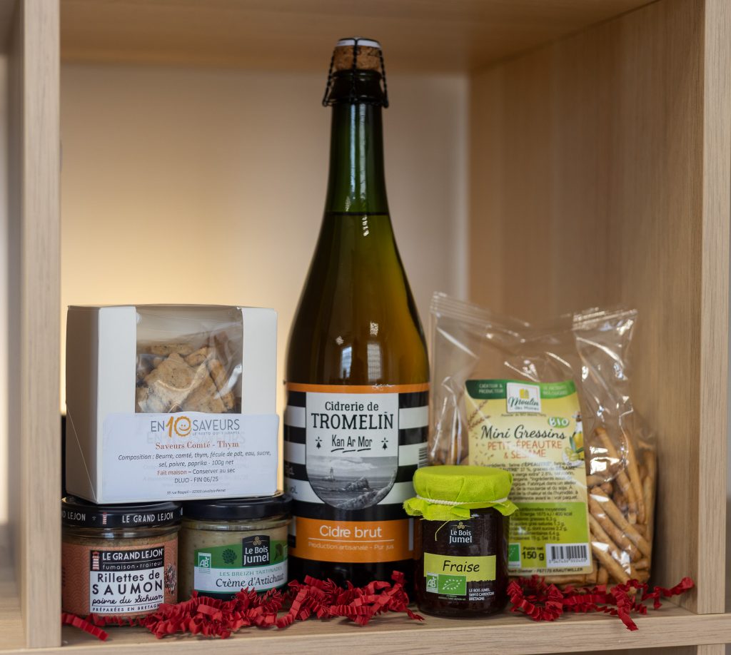 • Une sélection de produits faits maison accompagnés de mets artisanaux et locaux dont une bouteille d’alcool.En décembre une version spéciale Noël.